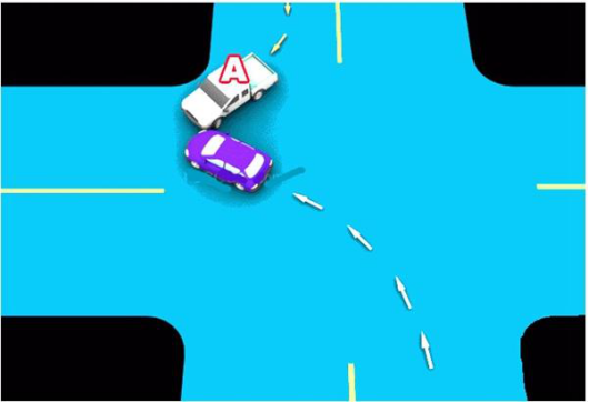 4、通过没有交通信号灯控制的路口时,在交通标志未规定哪边优先通行情况下,未让右方道路的来车先行的,图中所示为A车负全责。