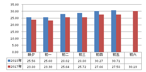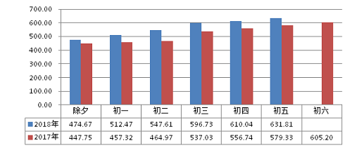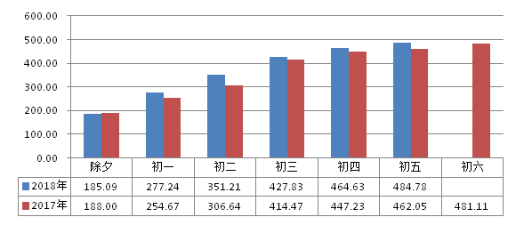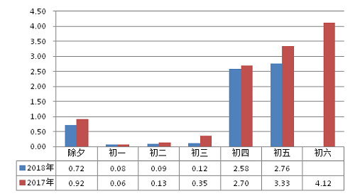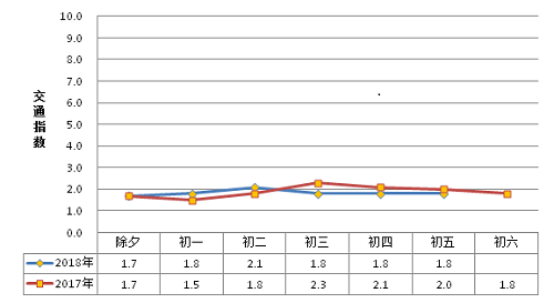 各日早晚高峰均未呈现明显高峰形态,总体均处于畅通或基本畅通级别;运行情况较去年同期进一步向好。初二压力相对较大,总体处于基本畅通级别;其他各日总体均处畅通级别,其中除夕全日均处于畅通状态。春节假期前六日高峰平均交通指数1.8,低于去年同期(1.9),降幅3.51%;交通指数峰值2.8,出现在初二(2月17日,11:15-11:30),低于去年(3.1)。