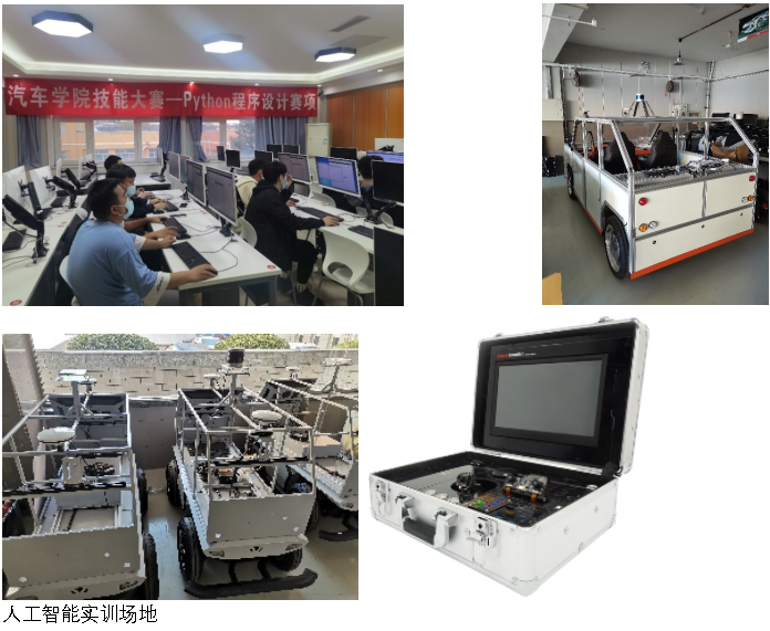 校内实训场地为人工智能多功能厅,配备超强算力的学生计算机,云计算平台资源、人工智能视觉设备等,满足学生专业学习和创新探索需要。校外实训基地涉及华为、百度及生态企业的工作现场。
