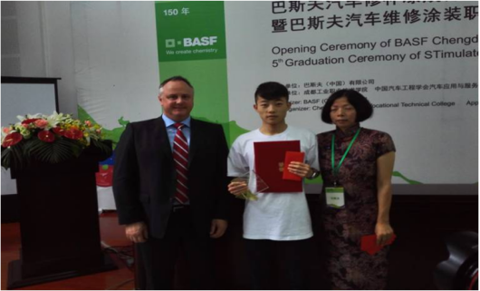 丁琪(中),2015年巴斯夫项目首届全国优秀毕业生技能比赛冠军,目前在廊坊燕宝宝马汽车服务有限公司工作。