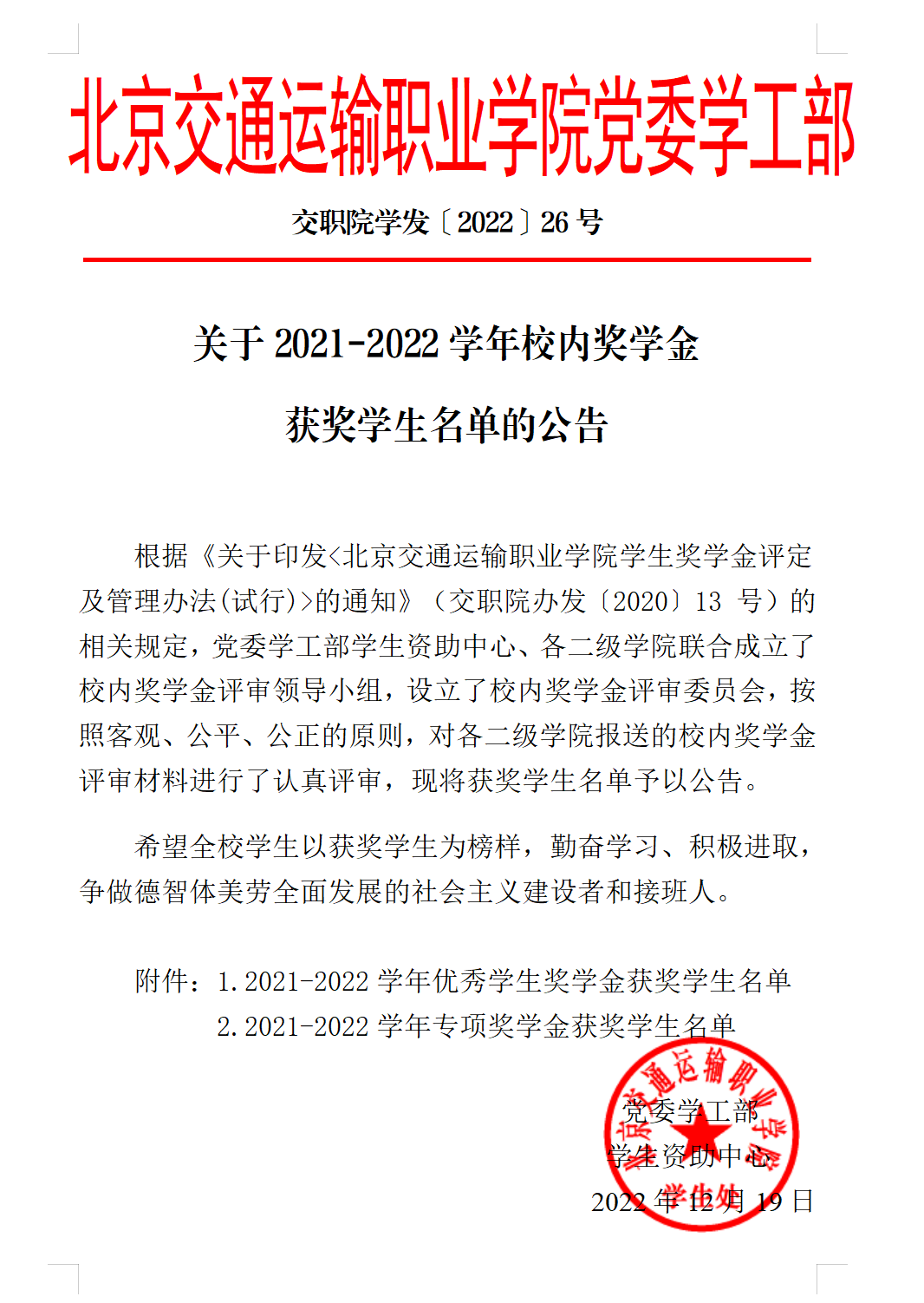 关于2021-2022学年校内奖学金获奖学生名单的公告