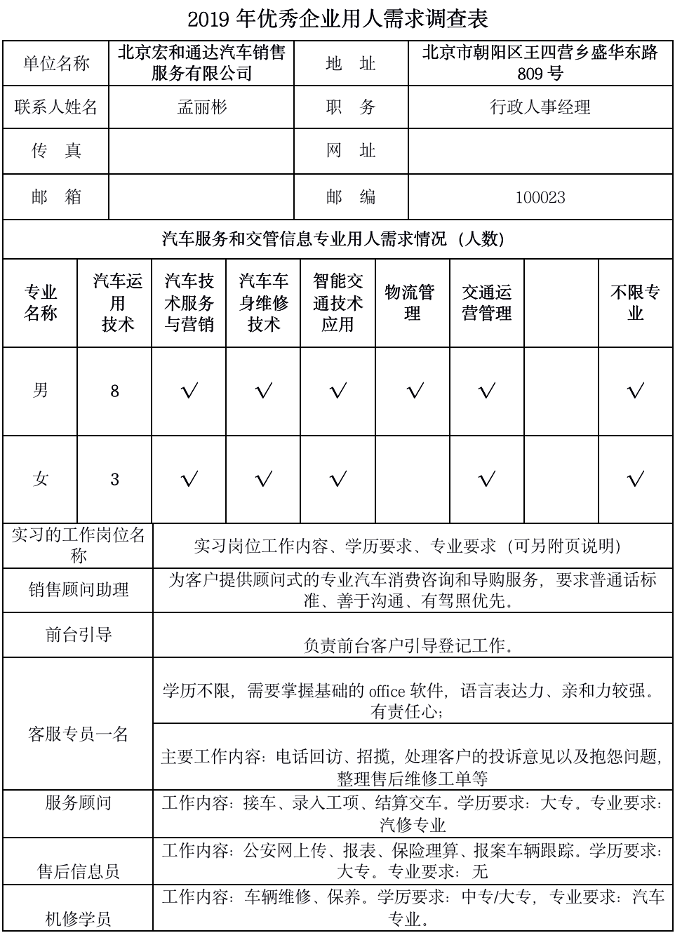“北京宏和通达”成立于2010年10月19日,坐落于北京市朝阳区王四营乡王四营村盛华东809路,现有员工80余人,公司总投资1500万。系集新车展示、销售、特约维修、零部件供应、信息反馈为一体的别克汽车4S店。公司拥有近1200平方米的现代化展厅,展示并销售各款别克汽车,提供最新的汽车资讯及全方位的优质服务。近1120平方米的厂房内配备了各种先进的进口维修、检修设备,能够及时收集汽车数据,准确判断车辆故障所在,及时对客户车辆进行维修。