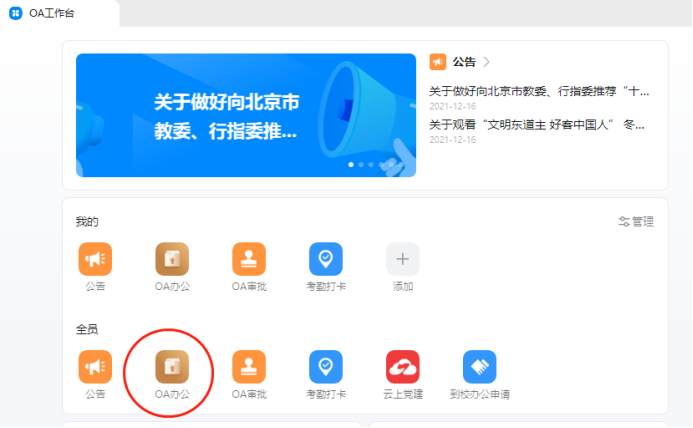 1、VPN的使用申请通过电子化的方式,借用钉钉“OA办公”流程进行。如下图,首先打开钉钉工作台,点击“OA办公”进入: