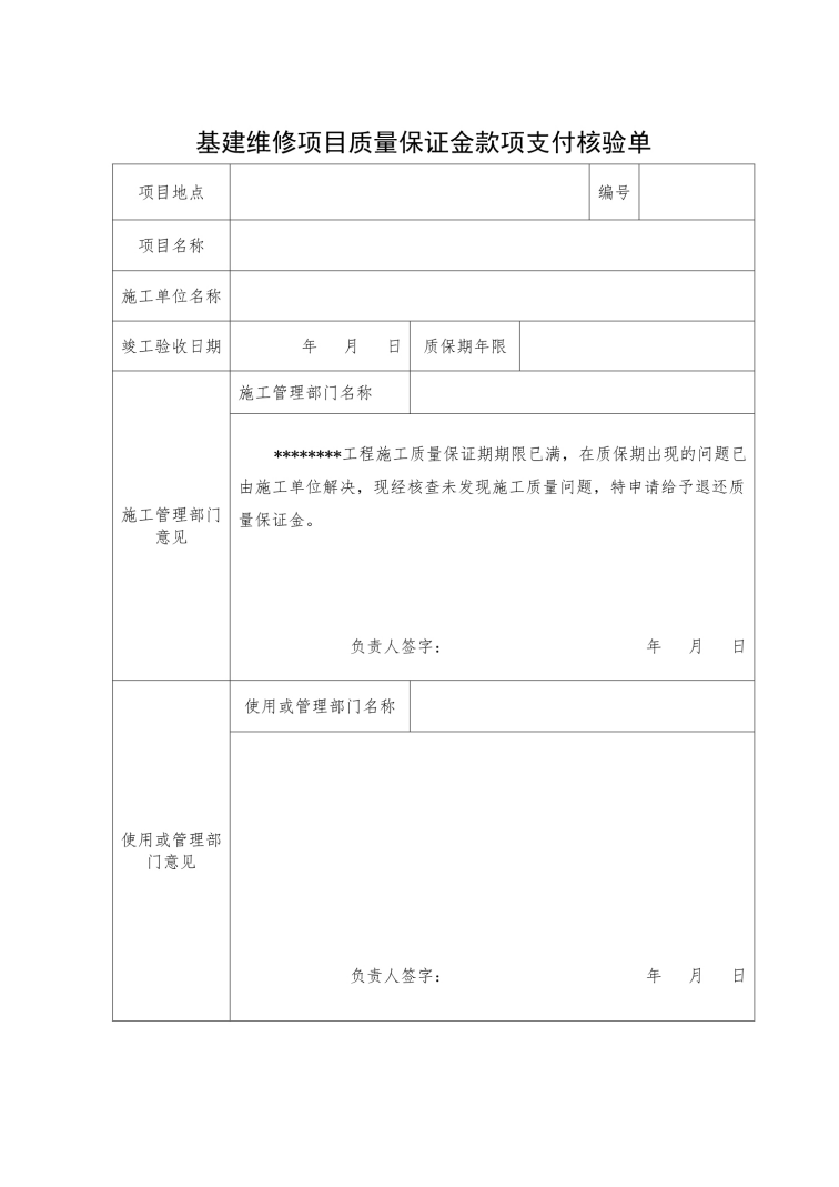 基建维修项目质量保证金款项支付核验单(样表)