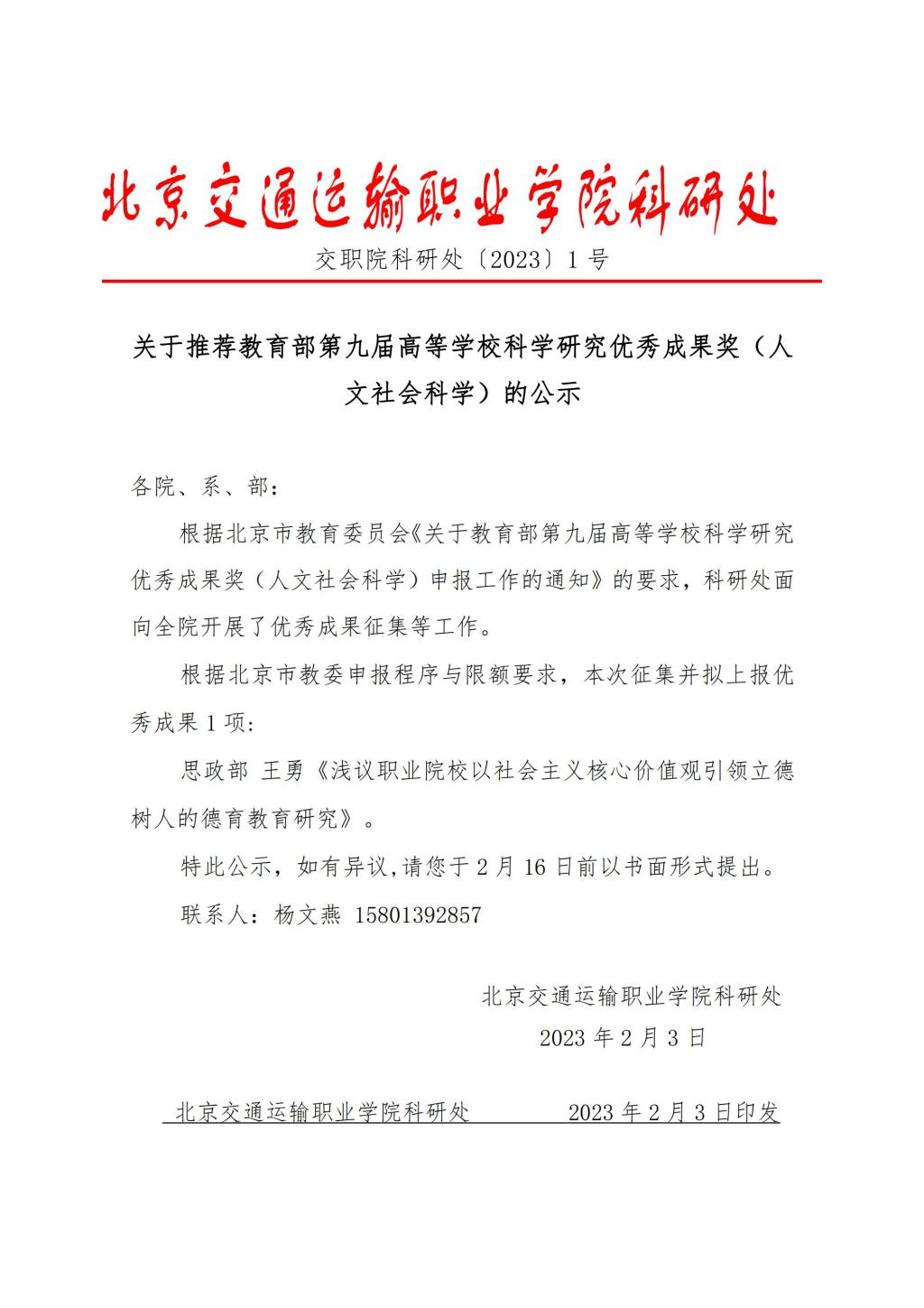 关于推荐教育部第九届高等学校科学研究优秀成果奖(人文社会科学)的公示